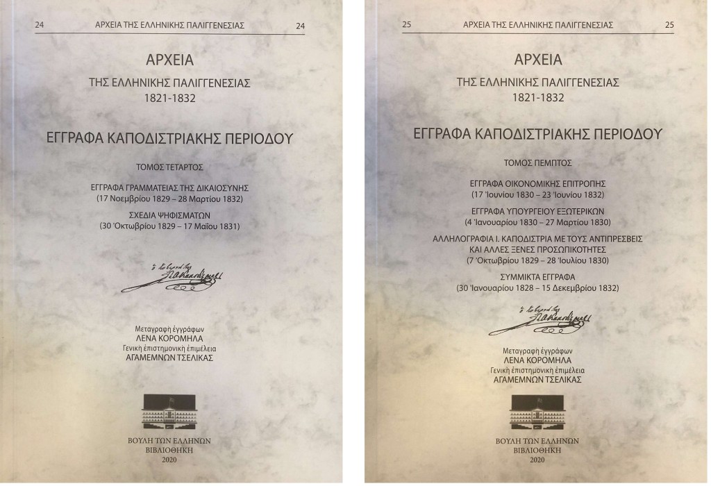 Με την ευκαιρία της επετείου της συμπλήρωσης 200 χρόνων από την έναρξη της Ελληνικής Επανάστασης του 1821, ολοκληρώθηκε η έντυπη σειρά των Αρχείων της Ελληνικής Παλιγγενεσίας. Τυπώθηκαν οι τόμοι 24 και 25, οι οποίοι περιλαμβάνουν έγγραφα της Καποδιστριακής Περιόδου: σχέδια ψηφισμάτων, της Γραμματείας της Δικαιοσύνης, της Οικονομικής Επιτροπής, του Υπουργείου Εξωτερικών, και αλληλογραφία του Κυβερνήτη με αντιπρέσβεις και γενικά προσωπικότητες της εποχής του.