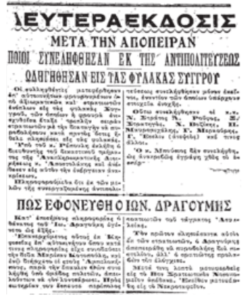 Την επομένη δεν κυκλοφόρησε καμία εφημερίδα της Αντιπολίτευσης, εξ αιτίας των καταστροφών της προηγουμένης ημέρας. Όλες οι βενιζελικές εφημερίδες φιλοξενούσαν την είδηση της απόπειρας κατά του Βενιζέλου, αφιερώνοντας λίγες μόνο λέξεις στη δολοφονία του Δραγούμη. Αρκετές μάλιστα υποστήριζαν ότι ο Δραγούμης σκοτώθηκε ενώ προσπαθούσε να ξεφύγει.. Κάποιες άλλες, όπως η εφημερίδα «Εμπρός», υποστήριξαν ότι οι εκτελεστές ήταν σε αυτοάμυνα γιατί τους άνοιξε πυρ ο ίδιος ο Δραγούμης με το περίστροφό του..