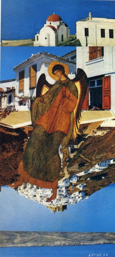 Ο Οδυσσέας Ελύτης σε εκκλησία της Πάρου, το 1954 (φωτ.: Ανδρέα Εμπειρίκου) – Κολάζ του Οδ. Ελύτη (δεκαετία ’70)