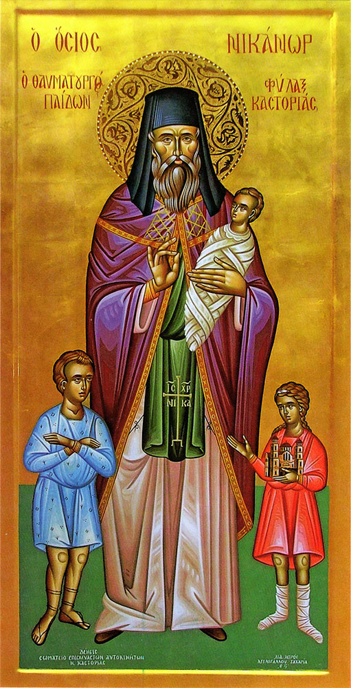 Νίκης εἴληφας, ἄφθαρτον στέφος, πάτερ ὅσιε, παρὰ τοῦ Κτίστου, τῶν σῶν ἀγώνων ἀντάξιον ἔπαθλον· τὴν γὰρ πατρίδα λιπὼν τὴν ἐπίγειον, τῆς οὐρανίου οἰκήτωρ γεγένησαι· ὅθεν πάντες σὲ πίστει καὶ πόθῳ γεραίρομεν· χαίροις Νικάνορ, Ὁσίων ὁμόσκηνε.