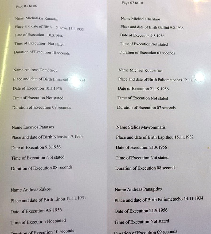 Το τέλος της αποικιοκρατίας στην Κύπρο έφερε στο φως μια από τις πιο φρικτές πρακτικές των βρετανών, που απαγχόνιζαν τους αγωνιστές της πατριωτικής οργάνωσης ΕΟΚΑ χωρίς να παραδίδουν τις σωρούς τους στους συγγενείς τους για την ταφή. Μέσα στις Φυλακές της Λευκωσίας, κατά τη διάρκεια του απελευθερωτικού αγώνα της ΕΟΚΑ (1955-1959), οι βρετανοί είχαν κατασκευάσει ένα μικρό κοιμητήριο, ανάμεσα στα κελιά των μελλοθανάτων και στον χώρο της αγχόνης. Ο περίβολος ήταν περίκλειστος από υψηλούς, συμπαγείς τοίχους, στο επάνω μέρος των οποίων είχαν «φυτέψει» κομμάτια από σπασμένα γυαλιά, ώστε να μην ήταν εφικτό στους κρατούμενους να δραπετεύσουν.. Για τούτο λέγεται πως η Κύπρος «είναι ίσως η μόνη χώρα του κόσμου που έχει φυλακισμένους ήρωες».