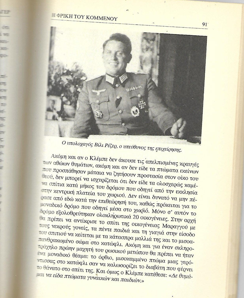 «Οἱ κάτοικοι τοῦ χωριοῦ ποὺ προσπαθοῦσαν νὰ διαφύγουν ἐκτελοῦνταν. Τὸ ἴδιο ἴσχυε καὶ γιὰ ὅσους κρύβονταν μέσα στὰ σπίτια. Ρίχναμε χειροβομβίδες μέσα στὰ σπίτια καὶ μετὰ πυροβολούσαμε μὲ καραμπῖνες καὶ αὐτόματα ὅπλα μέσα ἀπὸ κλειδαμπαρωμένες πόρτες. Ἡ ἐπίθεση κράτησε ἀρκετὲς ὧρες. Πολλὰ πτώματα κάηκαν μέσα στὰ σπίτια καὶ ἡ δυσοσμία ἦταν ἀφόρητη» (Στρατιώτης Γιόζεφ Ρήντλ).
