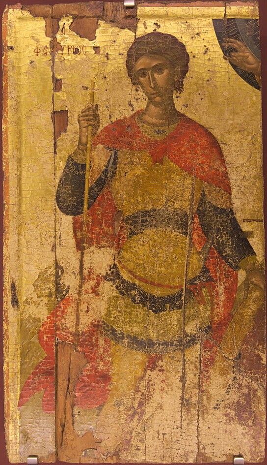 Ιερείς διέσωσας αιχμαλωσίας αθέου και δεσμά συνέθλασας δυνάμει Θεία, Θεόφρον, ήσχυνας τυράννων θράση γενναιοφρόνως, ηύφρανας Αγγέλων τάξεις Μεγαλομάρτυς, δια τούτο σε τιμώμεν, θείε οπλίτα, Φανούριε ένδοξε.
