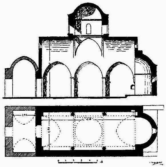 Τα τυφλά τόξα του βορείου και νοτίου τοίχου στηρίζονται σε δύο εντοιχισμένες κολόνες και στο δυτικό και στον ανατολικό τοίχο. Ο τρούλος επικάθηται στην ανατολική και δυτική καμάρα και σε αβαθή τόξα στη βόρεια και νότια πλευρά που βρίσκονται ψηλότερα από τα τυφλά τόξα του νότιου και του βόρειου τοίχου. Έχει εσωτερικές διαστάσεις 12,10 x 4,35 μ. περίπου χωρίς την αψίδα. Η αψίδα έχει χορδή 3,5 μ. και βέλος 1,80 μ. περίπου. Στα δυτικά υπάρχει νάρθηκας που καλύπτεται με οξυκόρυφη καμάρα.