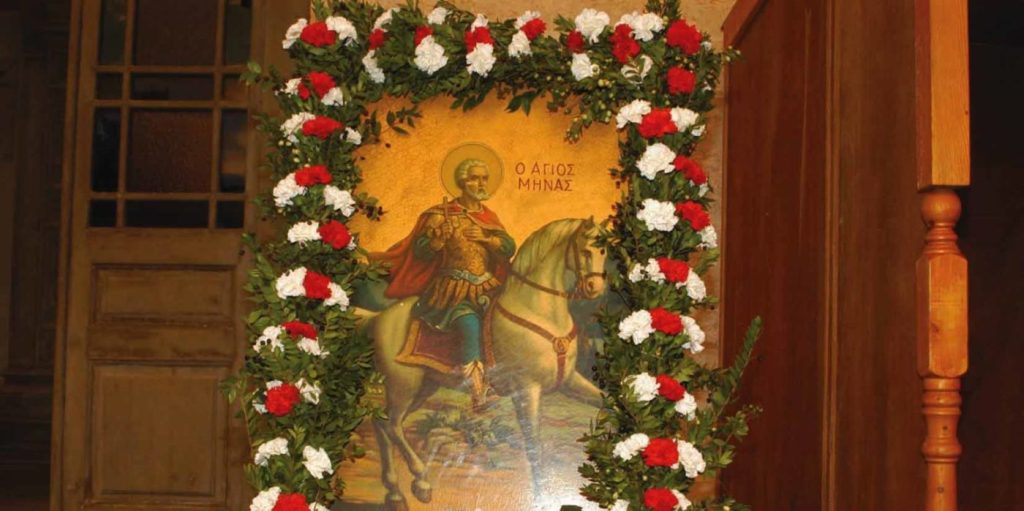 Τους μεγίστους αγώνας του μαρτυρίου σου, καρτεροψύχως ανύσας Μεγαλομάρτυς Μηνά, ουρανίων δωρεών λαμπρώς ηξίωσαι, και θαυμάτων αυτουργός, εκ Θεού αναδειχθείς, προστάτης ημίν εδόθης, και βοηθός εν ανάγκαις, και αντιλήπτωρ εναργέστατος.