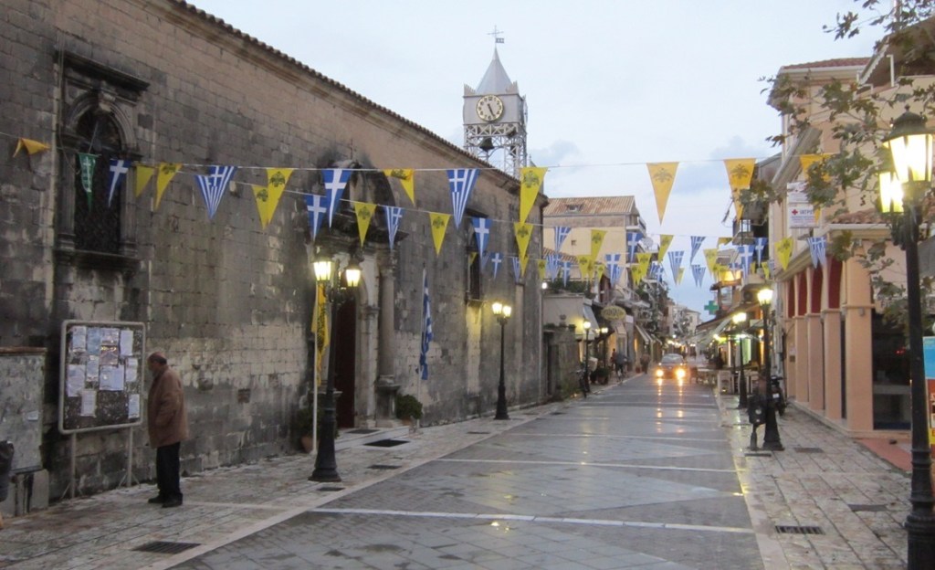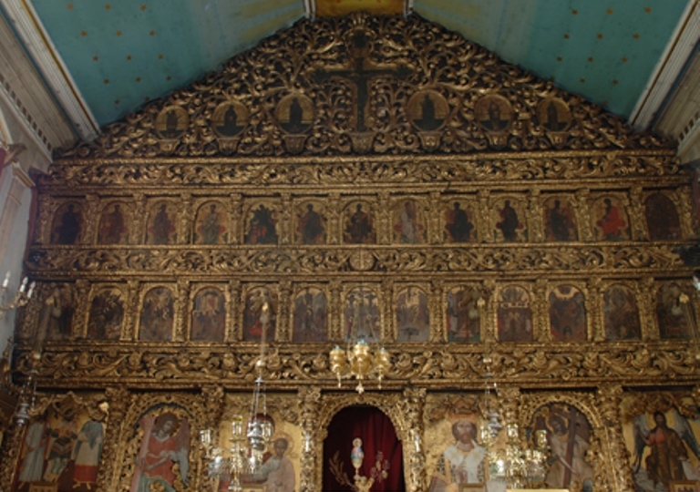 Οι περίφημες εικόνες της «ουρανίας» (οροφής), ζωγραφισμένες από τους σπουδαίους Επτανήσιους αγιογράφους Νικόλαο Δοξαρά και Νικόλαο Κουτούζη καταστράφηκαν από πυρκαγιά το 1977 και αντικαταστάθηκαν από αντίγραφά τους, έργα του σύγχρονου ντόπιου καλλιτέχνη Θεμιστοκλή Καρφάκη. Χαρακτηριστικό είναι επίσης και το σιδερένιο καμπαναριό του ναού.