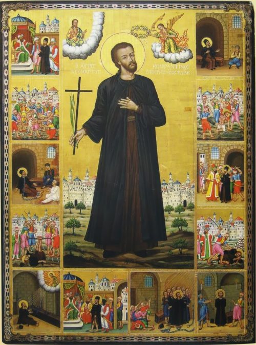 [1] Φορητή εικόνα του Αγίου νεομάρτυρος Κωνσταντίνου του Υδραίου στον Ιερό Ναό των Αγίων Κάρπου και Παπύλου Βλυχού Ύδρας.