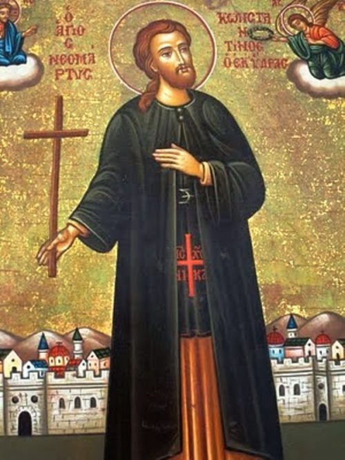 [22] Τοιχογραφία του Αγίου δια χειρός Ράλλη Κοψίδη στον εξωνάρθηκα του Καθολικού της Ιεράς Μονής Κοιμήσεως Θεοτόκου Πεντέλης Αττικής (ngalanakis.blogspot.gr).
