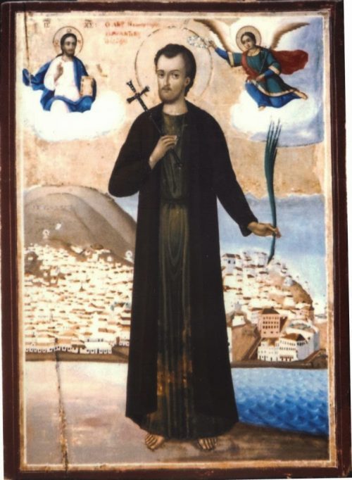 [25] Φορητή εικόνα του Αγίου στον Ιερό Ναό Αγίου Νικολάου Πατρών. Ιστορήθηκε το 1852 από τον επιφανή αγιογράφο Βυζάντιο (Δημήτριο Χατζηασλάνη) και αφιερώθηκε στον Ναό από τους Υδραίους των Πατρών (anastasiosk.blogspot.gr).
