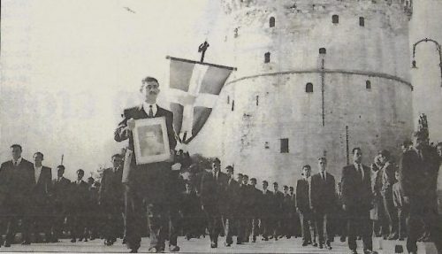 Μέλη της Συγκλήτου και φοιτητές του ΑΠΘ σε πορεία διαμαρτυρίας για τη δολοφονία του Κυριάκου Μάτση στη Θεσσαλονίκη, τον Νοέμβριο 1958 (kyriakosmatsis.com.cy)