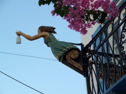 1. Ξύλινο ομοίωμα παλαιού ιστιοφόρου του Δημ. Μάρα. 2. ξύλινο παλαιό ακρόπρωρο σε μπαλκόνι του Γαλαξιδίου