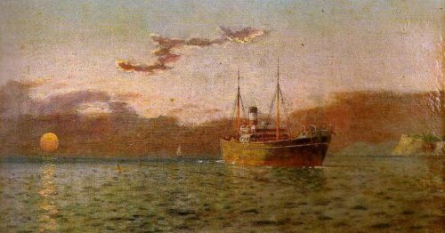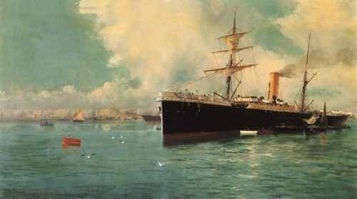 Ελληνικά ελλιμενισμένα πλοία (δεξιά: έργο του Κωνστ. Βολανάκη) (atexnos.gr, texni-zoi.blogspot.com)