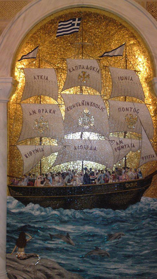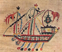 1. Καράβι κεντημένο με χάντρες. 2. Βυζαντινό καράβι, ψηφιδωτό του Γιώργου Φέσσα