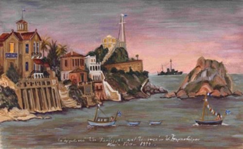 Επάνω: «Καράβι» του Πέτρου Μπρούσαλη (αριστερά). «Παραλία Λίνδου» της Τζένης Πιπακή (δεξιά). Κάτω: «Αγάντα γιαλέσα»… γρι γρι στο λιμάνι της Θερμής Λέσβου, το 1952 (αριστερά) και εμπορικό πλοίο στο Πλωμάρι (δεξιά)
