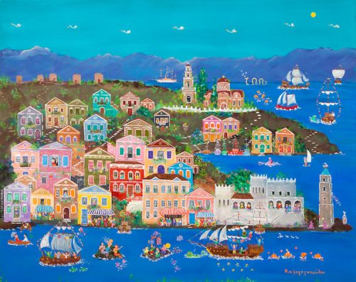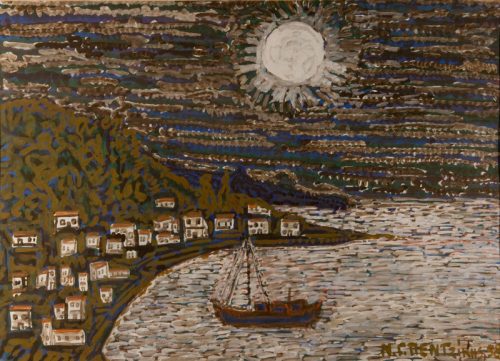 Η Χαλκιδική του Νίκου Γαβριήλ Πεντζίκη (αριστερά) και η Σύμη της Σοφίας Καλογεροπούλου (δεξιά) (pinterest, bonhams.com)