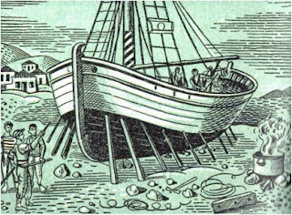 Το καράβι το γέννησε η ανάγκη, μα αυτή η σκληρή, η αναίσθητη, η αγέλαστη ανάγκη μεταπλάσθηκε, κατά κάποιον μυστηριώδη τρόπο, σε αγάπη, σε παλληκαριά, σε ενθουσιασμό, σε μεράκι, κι από ένα δεμάτι ξύλα, βουβό και άψυχο, δίχως εμορφιά, δίχως πνοή, γίνηκε σιγά – σιγά, το εμορφότερο έργο των χεριών του ανθρώπου, έργο τέλειο, ολοζώντανο, που τον κάνει να το χαίρεται και να το θαυμάζη, σαν να μην το έκανε αυτός. Το καράβι είναι σαν τον άνθρωπο, που ο Θεός πρώτα έπλασε το κορμί του κι ύστερα του φύσηξε την ψυχή «και εγένετο εις ψυχήν ζώσαν».