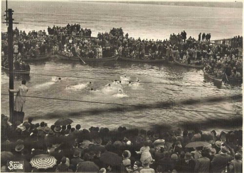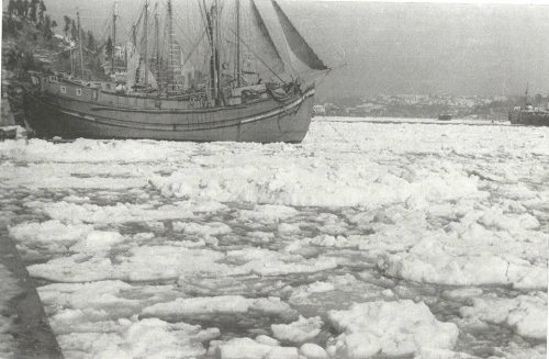 Αριστερά: Παλαιά φωτογραφία με πλοία αραγμένα στον παγωμένο Βόσπορο στο Μ. Ρεύμα. Δεξιά: Θεοφάνεια στο Μέγα Ρεύμα, το 1955