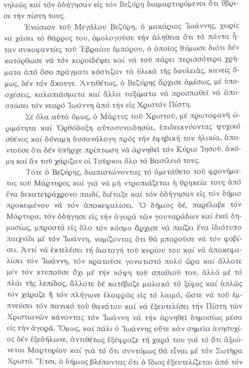 Το παιδί συνελήφθη και οδηγήθηκε μπροστά στον βεζίρη, όπου το πίεσαν ν’ αρνηθεί τον Χριστό. Όμως ο Ιωάννης δεν φοβήθηκε και με γενναιότητα απάντησε: «Δεν θ’ αρνηθώ ποτέ τον γλυκύτατο μου Ιησού Χριστό, και αν ακόμα μύρια βάσανα μου κάνετε και το βασίλειό σας όλο μου χαρίσετε». Βλέποντας ο βεζίρης την αμετάθετη γνώμη του παιδιού, διέταξε τον αποκεφαλισμό του. Έτσι, το ηρωικό παιδί οδηγήθηκε στην τοποθεσία «Τσαρσί των γουναράδων», όπου ο δήμιος έκοψε μαρτυρικά λίγο – λίγο το κεφάλι του, στις 20 Δεκεμβρίου 1652. Την νύχτα ευσεβείς Χριστιανοί πήραν το Άγιο λείψανο και το ενταφίασαν στο Μπέγιογλου (Πέραν).