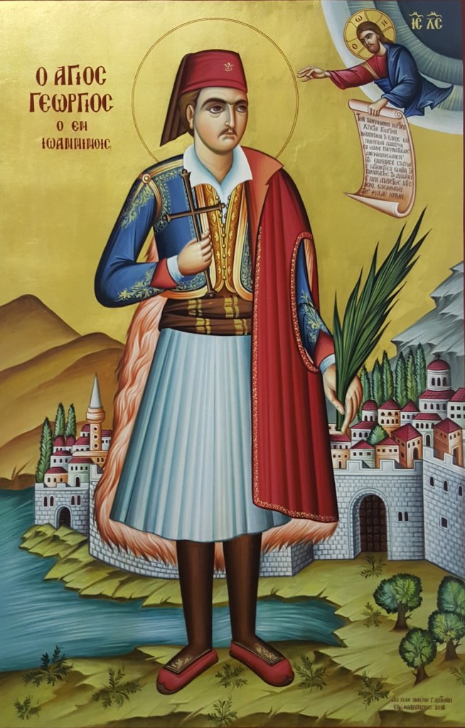 Τὸν πανεύφημον Μάρτυν Χριστοῦ Γεώργιον, Ἰωαννίνων τὸ κλέος καὶ πολιοῦχον λαμπρόν, ἐν ᾠδαῖς πνευματικαῖς ἀνευφημήσωμεν· ὅτι ἐνήθλησε στερρῶς, καὶ κατήνεγκεν ἐχθρόν, τοῦ Πνεύματος τῇ δυνάμει· καὶ νῦν ἀπαύστως πρεσβεύει, ἐλεηθῆναι τὰς ψυχὰς ἡμῶν.