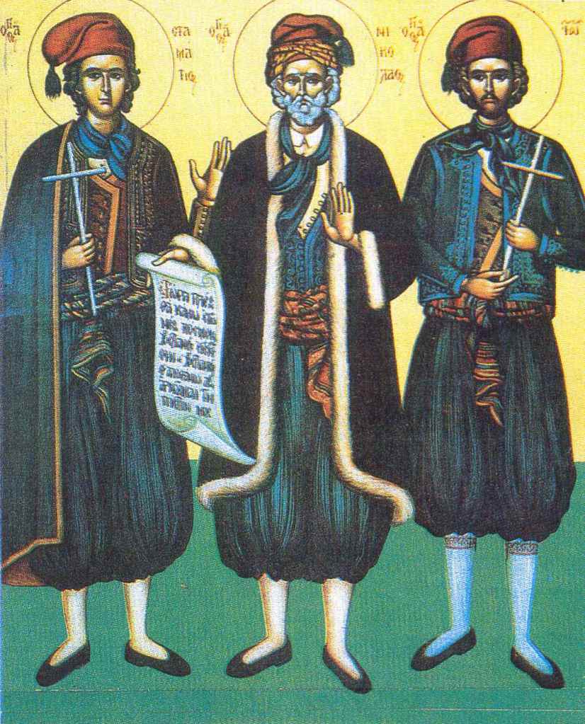 Νομίμως ἀθλήσαντες, ὑπὲρ Χριστοῦ τοῦ Θεοῦ, παμμάκαρ Σταμάτιε, σὺν Ἰωάννῃ ὁμοῦ, αὐτάδελφοι ἔνδοξοι, σύναθλον δὲ ἐν πᾶσι, τὸν Νικόλαον σχόντες, δόξης τῆς τῶν Μαρτύρων, ἠξιώθητε ἅμα, πρεσβεύοντες τῇ Τριάδι, ὑπὲρ τῶν ψυχῶν ἡμῶν.