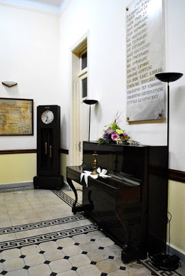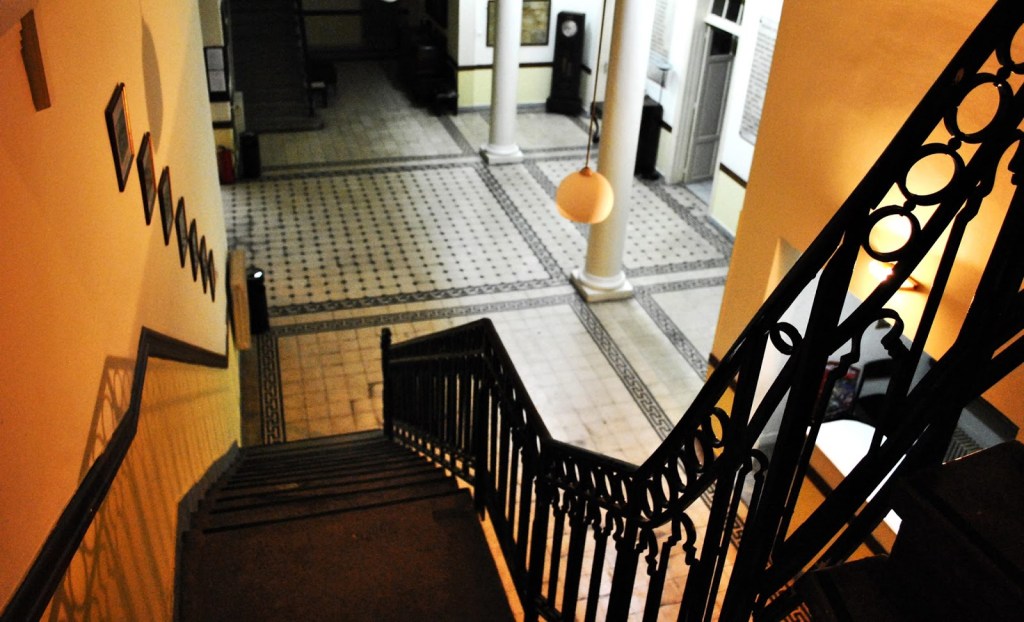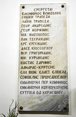 Βλέπουμε επίσης την εντυπωσιακή σκάλα (από μία σε κάθε πλευρά της εισόδου), που οδηγεί στον άνω όροφο. Διακρίνεται η ξύλινη κουπαστή και τα βαριά μασίφ κάγκελα! Επίσης, ο χώρος της εισόδου, όπως φαίνεται από ψηλά και στον οποίο υπάρχουν επίτοιχες μαρμάρινες πλάκες, με χαραγμένα τα ονόματα των μεγάλων ευεργετών του Συλλόγου. Σε μία από αυτές, διακρίνουμε μεταξύ άλλων, το όνομα του Ελευθερίου Βενιζέλου. Στις φωτογραφίες φαίνονται επίσης προθήκες με ιστορικά κειμήλια και διάφορα έγγραφα και αντικείμενα από δωρεές των μελών του Συλλόγου, καθώς και πινάκες μεγάλης άξιας που κοσμούν τον χώρο.