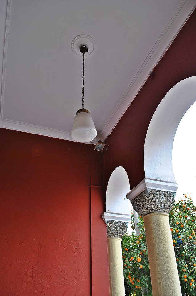 Στο εσωτερικό του κτηρίου, βλέπουμε τον χώρο της βιβλιοθήκης, λεπτομέρεια της οροφής με τα περίτεχνα κρεμαστά φωτιστικά, τον εντυπωσιακό χώρο της εισόδου με τα δυο εκατέρωθεν κλιμακοστάσια που οδηγούν στον άνω όροφο, διαφόρους χώρους, όπου κυριαρχούν τα παλιά κλασικά έπιπλα καθώς και κειμήλια και ενθυμήματα. Διακρίνονται επίσης τα ιδιαίτερης ομορφιάς παλιά πλακάκια στον χώρο της εισόδου, όπως και το βαρύ ξύλινο ρολόι, το πιάνο και η μοναδικής αισθητικής, μαντεμένια ξυλόσομπα!