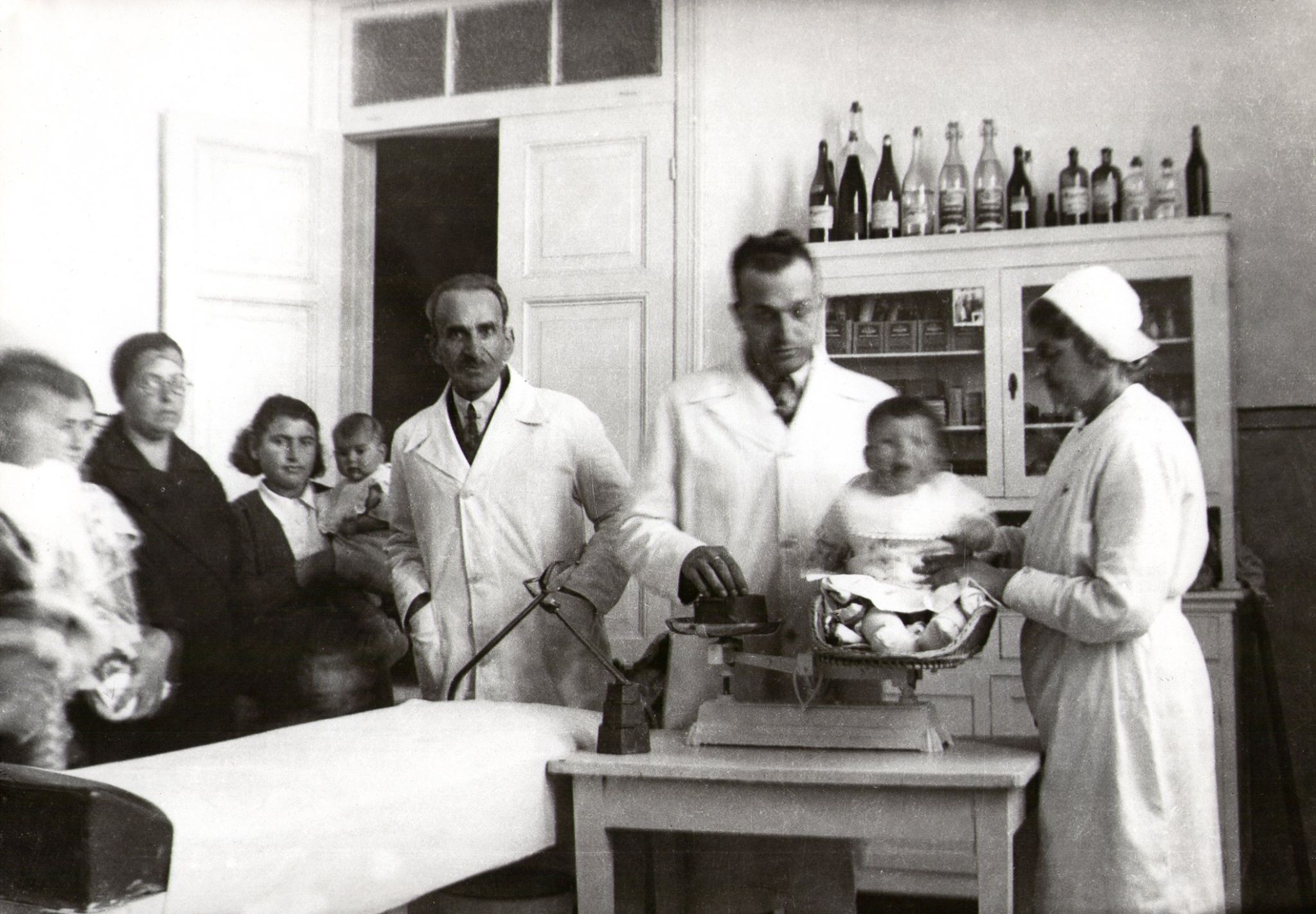 Ο ιατρός Απόστολος Σιταράς, στην είσοδο και στο ιατρείο του Συλλόγου Κωνσταντινουπολιτών, το 1932