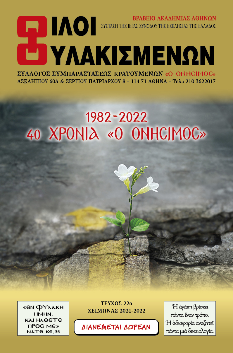 (Πληροφορίες: Σύλλογος Συμπαραστάσεως Κρατουμένων «Ο Ονήσιμος», Ασκληπιού 60Α’ και Σεργίου Πατριάρχου 8, Αθήνα, TK: 114-71, web: https://www.onisimos.gr/, info@onisimos.gr, τηλ.: 210 3622017, 3645305, facebook.com).