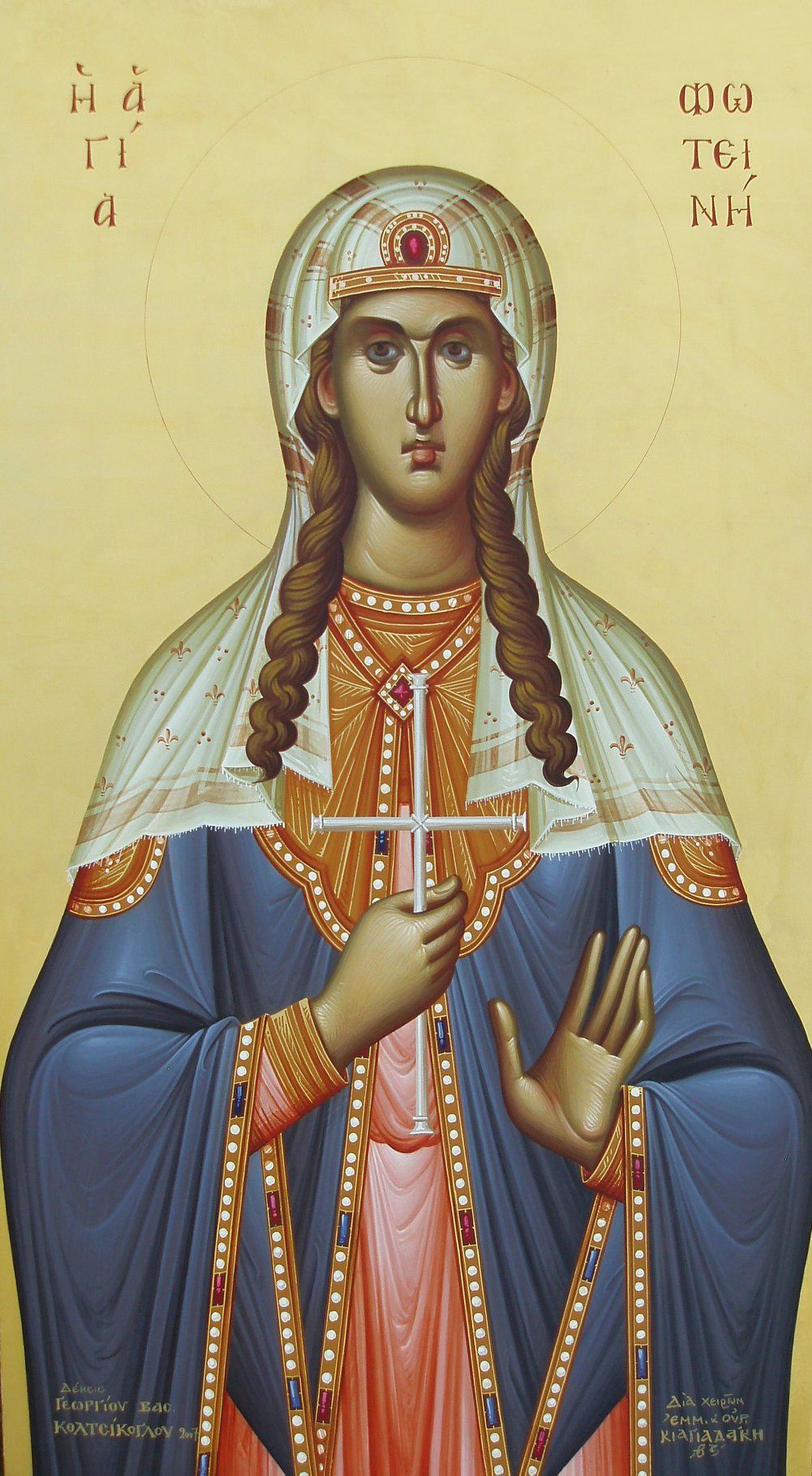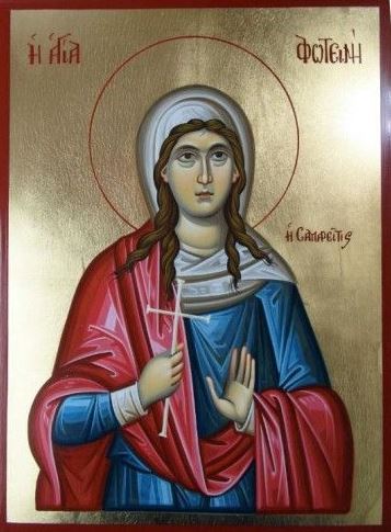 Θείω Πνεύματι καταυγασθείσα, και τοις νάμασι, καταρδευθείσα, παρά Χριστού του Σωτήρος, πανεύφημε, της σωτηρίας το ύδωρ κατέπιες, και τοις διψώσι αφθόνως μετέδωσας, Μεγαλομάρτυς και Ισαπόστολε Φωτεινή, Χριστόν τον Θεόν ικέκτευε, σωθήναι τας ψυχάς ημών.