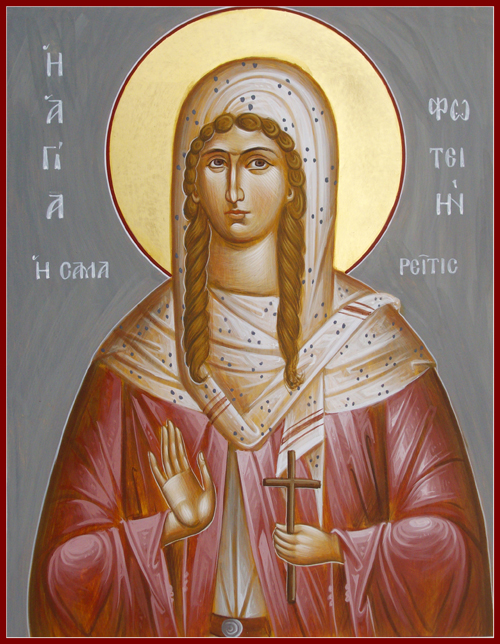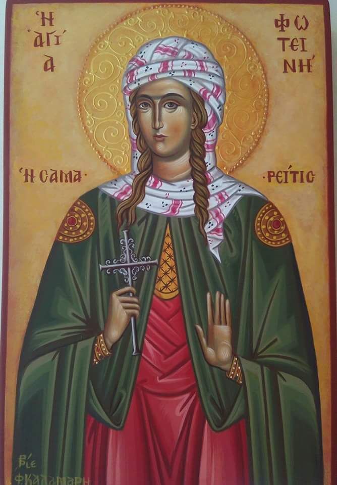 Η Αγία Φωτεινή έζησε στα χρόνια του Χριστού. Ήταν Σαμαρίτισσα στην καταγωγή και διέμενε στην πόλη Συχάρ. Εκείνο τον καιρό, ο Ιησούς περνούσε από την Συχάρ και στάθηκε στο πηγάδι του Ιακώβ για να πιει νερό. Εκεί συναντήθηκε με την Αγία Φωτεινή από την οποία ζήτησε να του δώσει νερό. Τότε οι Ιουδαίοι και οι Σαμαρείτες δεν είχαν επαφές και γι’ αυτό παραξενεύτηκε η Αγία που ένας Ιουδαίος της απηύθυνε τον λόγο. Το είπε αυτό στον Ιησού και Εκείνος της αποκρίθηκε ότι αν ήξερε ποιος είναι θα του ζητούσε αυτή νερό που δεν τελειώνει ποτέ και όταν το πιει κάποιος δεν ξαναδιψά, εννοώντας φυσικά τον Χριστό, η Αγία Φωτεινή πίστεψε σε Αυτόν και κάλεσε τους συμπολίτες της να τρέξουν να Τον συναντήσουν. Ο Χριστός έμεινε δύο ημέρες στη Συχάρ και τους μετέδωσε τον Λόγο και την ευλογία Του.