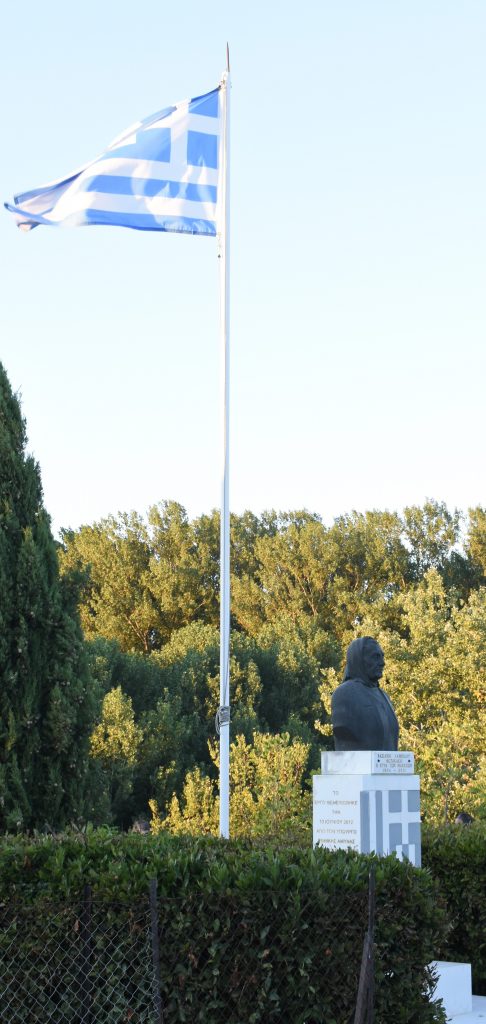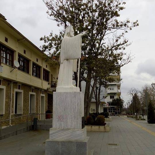 Σχεδόν πάντοτε ένα – δυο μικρά πουλάκια της πλατείας ξεφεύγουν από τις κοντινές φυλλωσιές και κουρνιάζουν ήρεμα πάνω στο χέρι του, που τείνει σε στάση διαρκούς ευλογίας. Σήμερα όμως το ολόλευκο χιόνι έχει σκεπάσει κάθε πτυχή του μαρτυρικού ράσου του και μόνο το βλέμμα του, καθάριο και διαπεραστικό, αγρυπνεί αιώνια για τον λαό του, για την πατρίδα μας, για όλα εκείνα τα άγια και τα ιερά που τίμησε μοναδικά με τη ζωή και το παράδειγμά του και που πια κανένας δεν μπορεί να του τα πάρει…