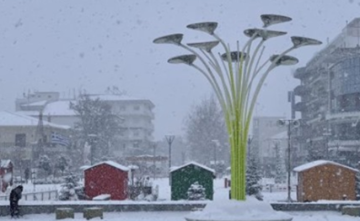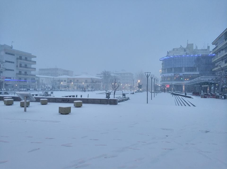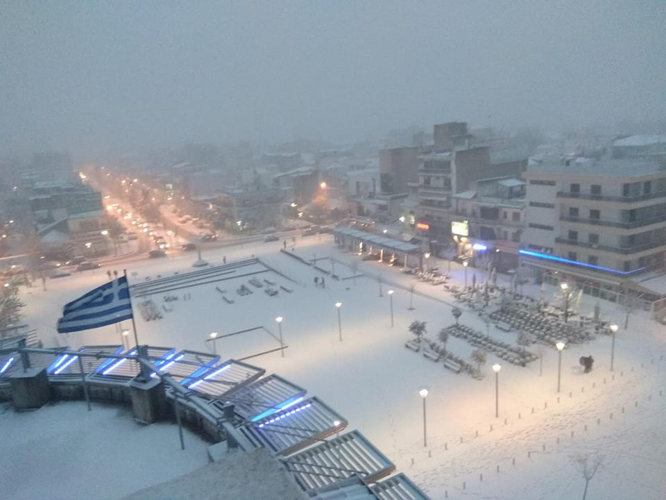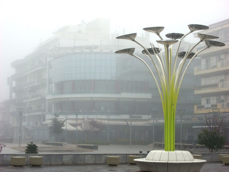 Η Πλατεία Δασίου στη Νέα Ορεστιάδα με το φωτοβολταϊκό πράσο, την πυκνή ομίχλη και το χιόνι