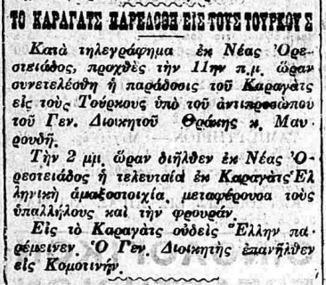 Κατά το εξάμηνο εκείνο μάλιστα το Κάραγατς ονομάστηκε «Ορεστιάδα» εις ανάμνησιν της περιπέτειας του μυθικού Ορέστη και οι οδοί του έλαβαν ελληνικές ονομασίες, οι ορθόδοξοι ναοί του λειτουργούσαν κανονικά και τα ελληνικά σχολειά του γέμισαν από ελληνόπουλα. Οι διαβουλεύσεις όμως των ισχυρών της εποχής στη Λωζάννη συνεχίζονταν για την τελική υπογραφή της ομώνυμης συνθήκης και ο Ελευθέριος Βενιζέλος, πληρεξούσιος εκπρόσωπος της ελληνικής πλευράς, προκειμένου να πετύχει μια γενικότερη ειρήνη, παραχώρησε στην Τουρκία και την τριγωνική περιοχή που ορίζεται από το προάστιο της Αδριανούπολης Κάραγατς και τα χωριά της Ντεμερντές και Μπόσνα.
