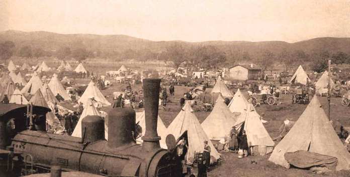 Οι μαρτυρικές πόλεις Αγχίαλος και Οικονομιό στην Ανατολική Θράκη (Φιλοπρόοδος Σύλλογος Νέας Αγχιάλου/Σελίδα στο fb, aimiliarousaki.blogspot.com). Κάτω: Καταυλισμός Ελλήνων της Ανατολικής Θράκης στην περιοχή της Θεσσαλονίκης, το 1914 (orthodoxianewsagency.gr)