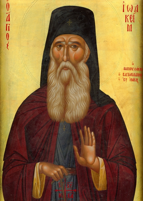 Χαίροις έγκαλλώπισμα μοναχών του Βατοπαιδίου καί Ιθάκης βλαστέ σεπτέ· χαίροις τής άγάπης πρός πέλας μυροθήκη, Ιωακείμ θεόφρον, ιεραπόστολε.