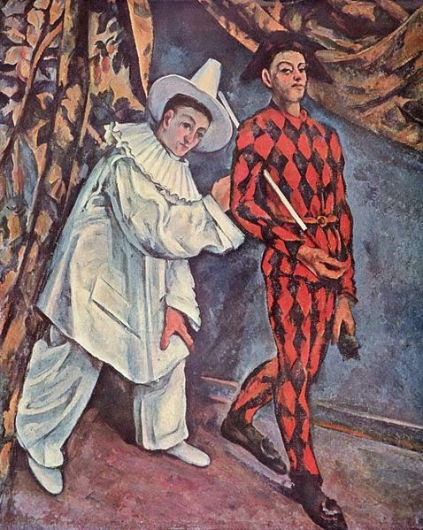 Την περίοδο 1888-1890 ο Γάλλος ζωγράφος Πωλ Σεζάν ζωγράφισε τέσσερα έργα με θέμα εμπνευσμένο από τους ήρωες της Commedia dell’Arte. Η νεανική αγάπη του Σεζάν για το καρναβάλι τον οδήγησε μάλλον σε μερικούς από τους πλέον διάσημους πίνακές του, με τον αγαπημένο Αρλεκίνο και τις παραλλαγές τους. Στον πρώτο πίνακα απεικονίζονται δύο χαρακτηριστικοί τύποι της ιταλικής παντομίμας, που ήταν ιδιαίτερα δημοφιλείς και στη Γαλλία, ο Πιερρότος (με τη λευκή στολή) και ο Αρλεκίνος. Ο Σεζάν ζήτησε από το γιο του να ποζάρει ως Αρλεκίνος, ως οδηγός μιας πομπής, ενώ ο Πιερότος τον ακολουθεί με το βλέμμα και το χέρι του να λιμπίζονται τη σκυτάλη από τη μασχάλη του Αρλεκίνου. Η αντίθεση στα κοστούμια, το στενό και το φαρδύ κοστούμι του ενός και του άλλου, οι κόκκινοι και μαύροι ρόμβοι του Αρλεκίνου, προβάλει και την αντίθεση και διαφορετικότητα των χαρακτήρων. Ο Αρλεκίνος σχεδόν πάντα καταφέρνει να κερδίσει από τον Πιερότο την αγαπημένη του, την Κολομπίνα. Στους τρεις άλλους πίνακες απεικονίζεται μόνος του ο Αρλεκίνος, αυτός ο κουτοπόνηρος υπηρέτης, που φορά συνήθως μία στολή με πολύχρωμα μπαλώματα. Ο Σεζάν ωστόσο προτιμά να τον απεικονίσει με μία κόκκινη στολή με μαύρα μπαλώματα.