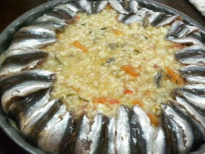 Αυτό το θαυμάσιο και μοναδικό ριζότο μαγειρεύεται πρώτα κανονικά και μετά καλύπτεται με τα φιλέτα του γαύρου και ψήνεται στο φούρνο. Το ριζότο απορροφά τη γεύση του γαύρου, όσο ψήνεται, και γίνεται ένα νοστιμότατο και χορταστικό γεύμα! Όσοι νηστεύετε και θέλετε να το φτιάξετε του Ευαγγελισμού ή την Κυριακή των Βαΐων, μπορείτε να παραλείψετε τη φέτα.