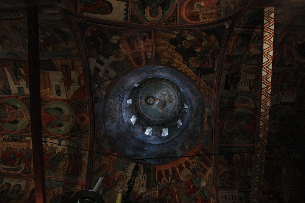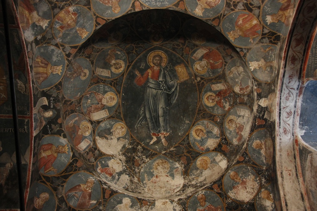 Αριστερά της εισόδου στον τελευταίο τρούλο, ο επισκέπτης θαυμάζει αγιογραφημένους ψηλά τον Αριστοτέλη, τον Πλάτωνα, τον Σόλωνα και τον Πλούταρχο, στους οποίους έχει αποδοθεί η τιμή να απεικονίζονται μεταξύ των αγίων, επειδή απέρριψαν τον πολυθεϊσμό και μίλησαν για μια παγκόσμια δύναμη που δημιουργεί τον κόσμο. Στο παλιό σχολείο των Πεδινών λίγο πιο πάνω από τη μονή μπορεί κανείς να θαυμάσει και να ψηλαφίσει παλαιά πολύτιμα βιβλία που κάποτε είχε διαβάσει ο ίδιος ο Νεόφυτος Δούκας, βιβλία – κειμήλια σε πολλές γλώσσες της τότε εποχής.