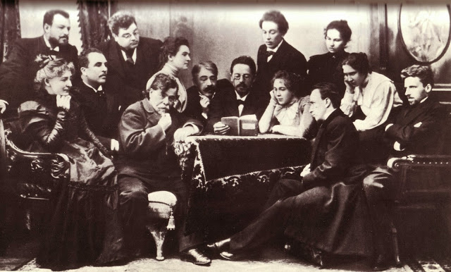 Από την παράσταση του «Γλάρου» στο Θέατρο Τέχνης της Μόσχας. Στο κέντρο ο Τσέχωφ διαβάζει το έργο του – δεξιά του, ο Στανισλάφσκι