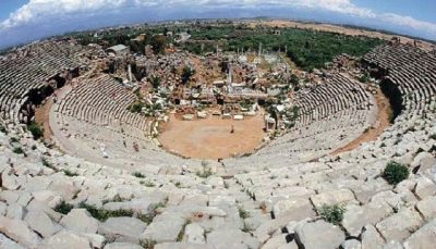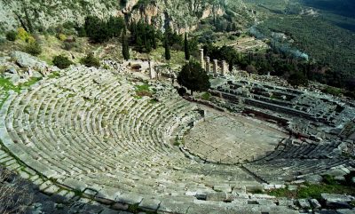 Αρχαία θέατρα Δωδώνης και Επιδαύρου (επάνω) και Δελφών και Παμφυλίας (κάτω)