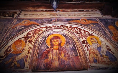 Το περίτεχνο τέμπλο του ναού και τοιχογραφία της Αγίας Μαρίνας
