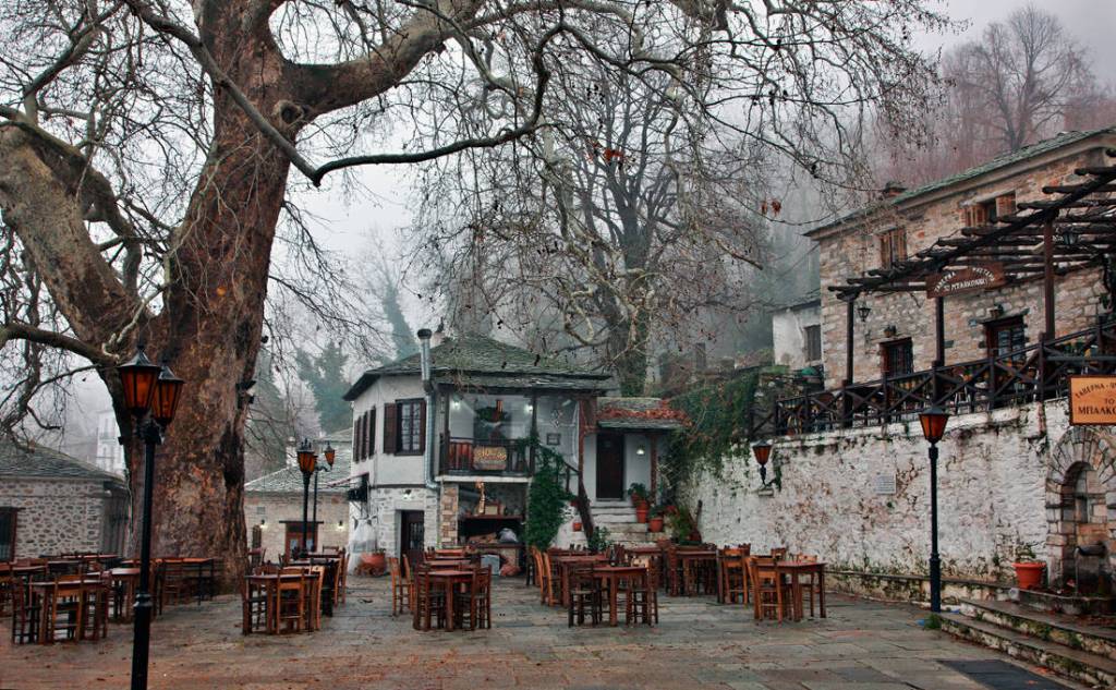 Η λιθόστρωτη πλατεία των Χιονιάδων με τη βρύση και τον πλάτανο