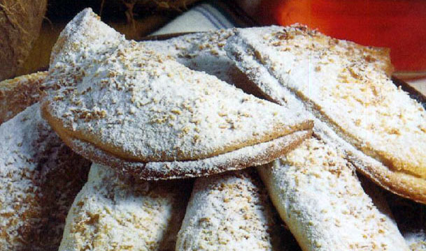 Σε ένα μπολ βάζουμε όλα τα υλικά της γέμισης, ανακατεύουμε και αφήνετε στην άκρη. Σε μεγάλο μπολ κοσκινίζουμε το αλεύρι (κρατάμε 1 κούπα), προσθέτουμε όλα τα υλικά της ζύμης και ζυμώνουμε με το χέρι ή με το ειδικό εργαλείο στο μίξερ μέχρι να πετύχουμε μια λεία ζύμη. Η ζύμη πρέπει να είναι μαλακή και εύπλαστη γι’ αυτό προσθέτουμε σταδιακά το αλεύρι που κρατήσαμε μέχρι να αποκτήσουμε τη ζύμη που θέλουμε. Παίρνουμε μικρές ποσότητες από τη ζύμη, πλάθουμε σε μπάλες και ανοίγουμε φύλλα με πλάστη 3 εκ. πάχους πάνω σε αλευρωμένη επιφάνεια. Με ένα στρογγυλό κουπ πατ ή με πιατάκι από ένα φλιτζάνι κόβουμε τα φύλλα σε στρογγυλά κομμάτια. Παίρνουμε με ένα κουταλάκι του γλυκού μια μικρή ποσότητα γέμισης και τη βάζουμε στην άκρη κάθε κομματιού. Διπλώνουμε σε σχήμα μισοφέγγαρου. Κολλάμε τις άκρες της ζύμης να μην ανοίξουν. Τοποθετούμε σε λαδωμένο αντικολλητικό ταψί και ψήνουμε στους 180 βαθμούς για 20-25 λεπτά περίπου να ροδίσουν. Βγάζουμε από το φούρνο και μόλις κρυώσουν πασπαλίζουμε με ζάχαρη άχνη και κανέλα.