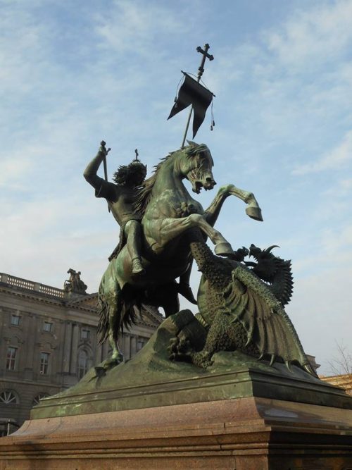 Ένα από τα αριστουργήματα της παγκόσμιας γλυπτικής αποτελεί το μεγαλειώδες άγαλμα του έφιππου Αγίου Γεωργίου, που παλεύει με τον δράκοντα, στο Βερολίνο. Το ύψους 6 μέτρων γλυπτό του Αυγούστου Κις (August Kiss, 1802-1865) δημιουργήθηκε το 1853 και είναι συναρπαστικό για τον λεπτομερή σχεδιασμό του. Το γλυπτό βρισκόταν στην αυλή του Ανακτόρου του Βερολίνου (Stadtschloss) μέχρι την κατεδάφισή του, οπότε μεταφέρθηκε στο πάρκο Volkspark Friedrichshain. Το 1987 μεταφέρθηκε εκ νέου στη συνοικία Nikolaiviertel στο κέντρο του Βερολίνου, σε μια μικρή πλατεία δίπλα στον ποταμό Spree, όπου βρίσκεται έως και σήμερα.