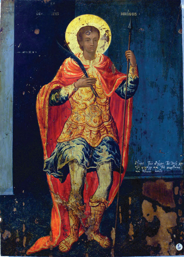Μέγαν σε προστάτην καὶ βοηθόν, κεκτήμεθα μάρτυς, πεπτωκότες ἐν πειρασμοῖς, ῥῦσαι οὖν παμμάκαρ, ἡμᾶς λοιμοῦ λιμοῦ τε, ὁρμῆς παίδων τῆς ἄγαρ, θεῖε Νικόλαε.
