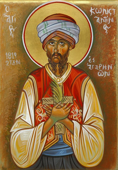 Πᾶσαν ηὔφρανας, πιστῶν χορείαν, καί κατήσχυνας, τούς Ἄγαρ γόνους, ἀνακηρύξας λαμπρῶς τήν εὐσέβειαν, καί ὑπομείνας ἀνύποιστα βάσανα, ὦ Κωνσταντῖνε Μαρτύρων ἀγλάϊσμα. Ὡς οὖν ἔτυχες, οὗπερ ἐπόθεις ἀοίδιμε, μνημόνευε ἡμῶν τῶν εὐφημούντων Σε.