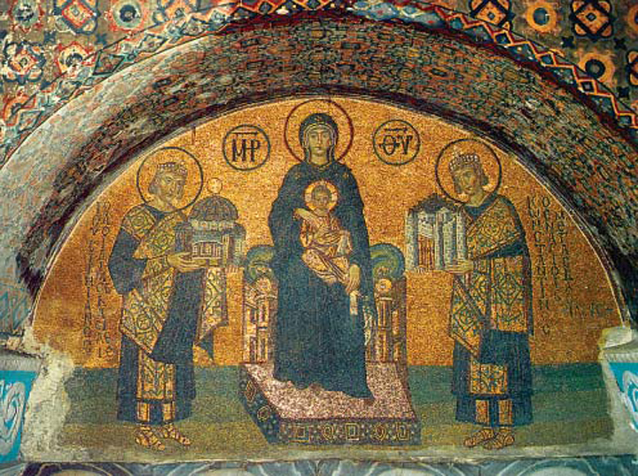 Στη Βυζαντινή αγιογραφία, η εικόνα των δύο κορυφαίων αυτοκρατόρων της Νέας Ρώμης, Κωνσταντίνου του Μεγάλου και Ιουστινιανού Α’, που προσφέρουν στην Κυρία Θεοτόκο την Πόλη και το ύψιστο δημιούργημά της, τον ναό της Αγίας του Θεού Σοφίας, μέσα από το απαράμιλλης τέχνης ψηφιδωτό της νοτιοδυτικής πύλης της Αγίας Σοφίας Κωνσταντινουπόλεως, απεικονίζει περίτρανα την ιδέα της ευχαριστιακής στάσης ζωής που κυριάρχησε σε ολόκληρη την ιστορία και την κληρονομιά του Βυζαντίνου. Εδώ ο Αυτοκράτορας δεν είναι ένας απόμακρος -ή ακόμα και σκληρός ή απάνθρωπος ηγεμόνας, αλλά «ο πρώτος που γίνεται έσχατος» για χάρη του λαού του.