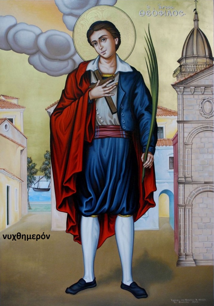 Χριστοῦ δῆμος ᾄσμασιν, ἀνευφημεῖ ἐπαξίως, τοὺς λαμπροὺς ἀγῶνάς σου, Μάρτυς Θεόφιλε θεῖε, ἤνεγκας, καὶ γὰρ γενναίως εἱρκτὴν ζοφώδη, ἔφερας, πικρὰς αἰκίας καὶ ἀνυποίστους, καὶ τὸν θάνατον ἐδέξω, πυρὸς ἐν μέσῳ, ὡς φίλος ὄντως Θεοῦ.