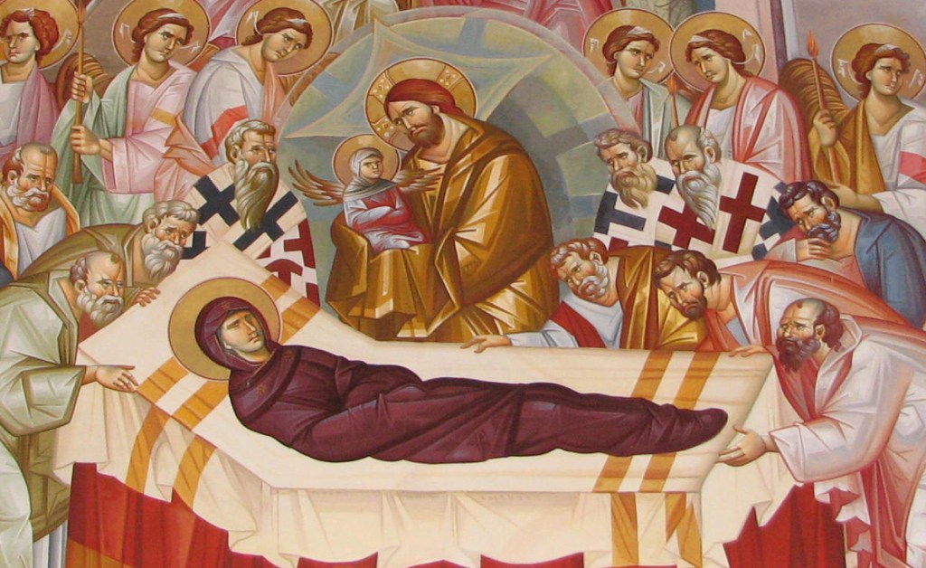 Στην Ορθόδοξη Χριστιανική Εκκλησία ο εορτασμός της Κοιμήσεως της Θεοτόκου περιλαμβάνει κατά πρώτο λόγο το θάνατο και την ταφή της Παναγίας και κατά δεύτερο την ανάσταση και τη μετάστασή της στους ουρανούς. Για την Κοίμηση της Θεοτόκου δεν υπάρχουν πληροφορίες από την Καινή Διαθήκη. Γι’ αυτήν μαθαίνουμε από τις διηγήσεις σημαντικών εκκλησιαστικών ανδρών, όπως των Αγίου Ιωάννου του Θεολόγου, Διονυσίου του Αρεοπαγίτη, Μόδεστου Ιεροσολύμων, Ανδρέα Κρήτης, Γερμανού Κωνσταντινουπόλεως, Ιωάννη Δαμασκηνού κ.ά. καθώς και από τα σχετικά τροπάρια της εκκλησιαστικής υμνολογίας. Στα κείμενα αυτά διασώζεται η «αρχαία και αληθεστάτη» παράδοση της Εκκλησίας γι’ αυτό το Θεομητορικό γεγονός.