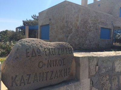 Η οικία Μόραλη, έργο του Άρη Κωνσταντινίδη και σημείο αναφοράς για την αρχιτεκτονική στον τόπο μας, πλέει γαληνεμένη πάνω στις λιτές γραμμές της και στην ακατέργαστη ύλη της, ένα σπίτι όπου όλα σημαίνουν και φαίνονται, ανοιγμένα στο φως και στ’ αγέρι που μπάζει σ’ ευρύχωρες κάμαρες. Σιμά η αυλή του γλύπτη Καπράλου, όπου έμψυχα λες τα έργα του ρουφούν αδηφάγα τον ήλιο του μεσημεριού ή υψώνουν καρτέρι στις σκιές της νύχτας. Κι αμέσως μετά, σπίτι – ακρωτήρι μες τη λίθινη μνήμη του, ο τόπος όπου έζησε και δημιούργησε ο Νίκος Καζαντζάκης. Αν ίσως τελικά τα σπίτια «παίρνουν» -κατά πώς λένε- από εκείνους που τα κατοικούν, τούτο το σπίτι τέμνει τη βόρεια στροφή του νησιού εισβάλλοντας καταμεσής της, σαν να μη γίνεται να πάρεις τη στροφή αν δεν περάσεις μέσα απ’ το κτήμα του! Και δεν μπορώ να μη σκεφτώ, πως έτσι ακριβώς σε καιρούς αλλοτινούς, ενάντια -όπως και το σπίτι του- σε κάθε λογής βοριάδες, κείνος που έζησε εκεί έθεσε τις δικές του πανανθρώπινες τομές στις μεγάλες στροφές της ιστορίας και στα ελληνικά γράμματα, επαναπροσδιορίζοντας με τη ζωή και το έργο του τις αιώνιες αξίες της ελευθερίας, της δικαιοσύνης και της ομορφιάς κι αυτού που, με μια λέξη, στην Ελλάδα ονομάζουμε «λεβεντιά».